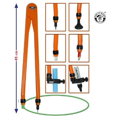 A körző mindkét szára többfunkciós. A középponban hegyes vagy tapadókorongos rögzítéssel. A másik szár esetében kölönböző átalkítók segítségével krétát, filcet vagy más rajzeszközt lehet használni. Kb. 70cm-es körátmérőig használható.