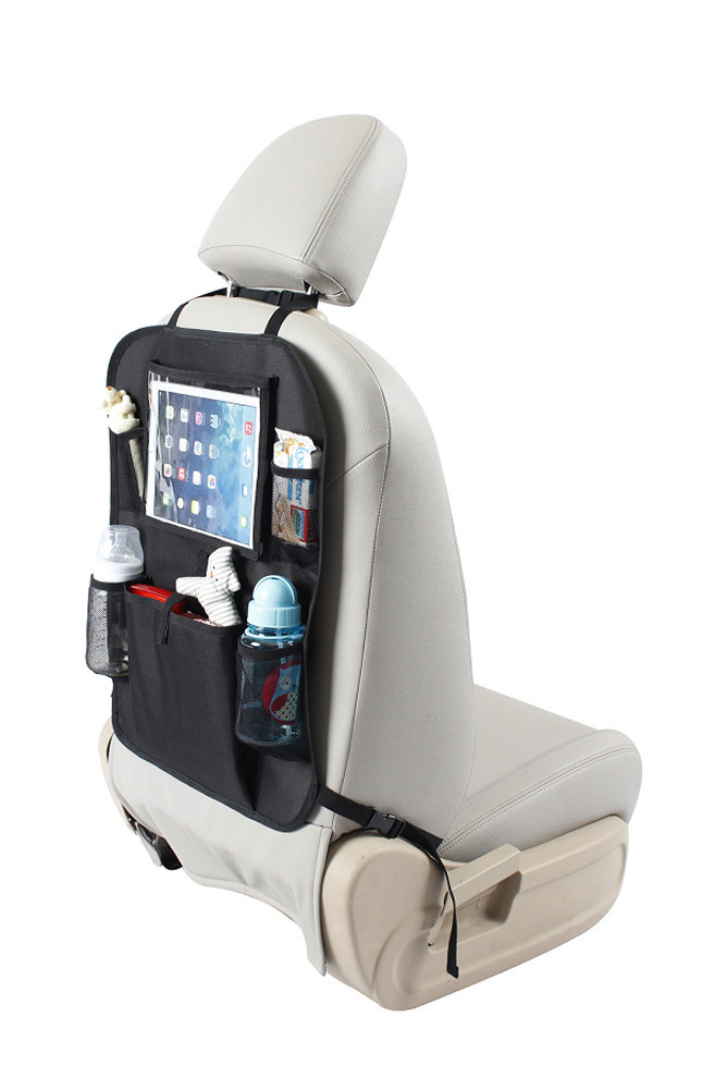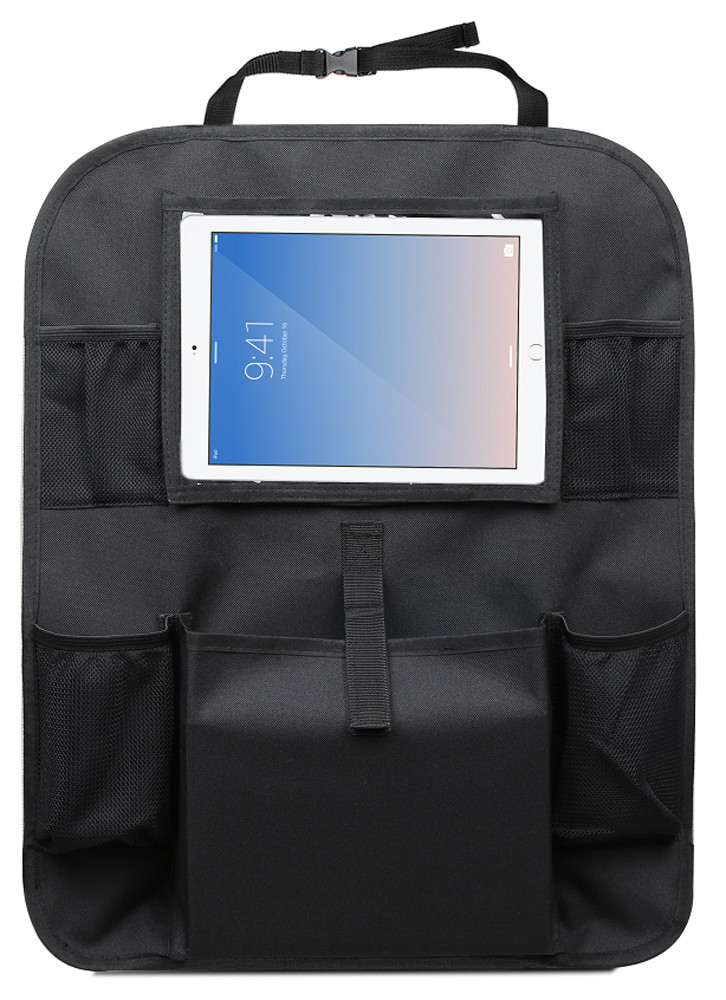 Az univerzális rögzítésnek köszönhetően szinte minden autóval kompatibilis. A rendszerező a táblagépzseb mellett 4 hálós zsebet és egy extra nagy központi rekeszt is tartalmaz.