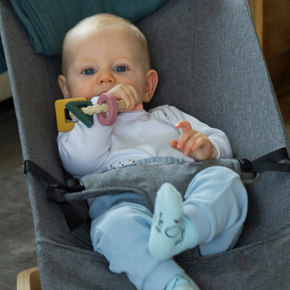 • A puha szilikon rágóka 3 izgalmas elemet tartalmazó gyűrűből áll kizárólag élelmiszer-minőségű, BPA-mentes szilikonból készült