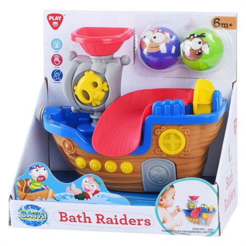 Interaktív fürdőjáték különböző élményelemekkel, melyek a víz hatására kelnek életre. A hajón található vízkerék, vízkiömlő nyílás, spriccelő ágyúk és egy csúszda is, melyen a két, vidám kalózt ábrázoló golyó legurítható. A termék hátoldalán található tapadókorongok segítségével a hajó a csempére vagy a kád falára rögzíthető.
