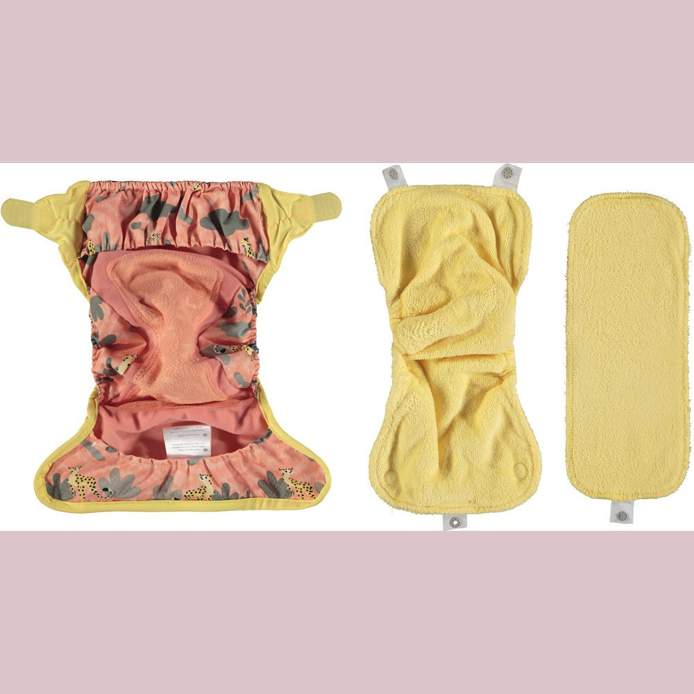 **A termék egy darab egyméretes pelenkát és egy hozzá tartozó bambusz nedvszívó betétet tartalmaz.