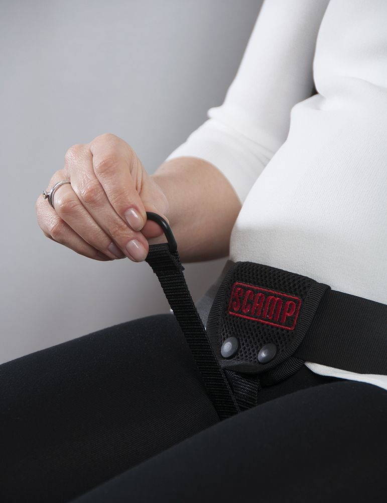 A Scamp biztonsági övterelő az autó bekapcsolt állapotban lévő biztonsági övének combon áthaladó részét az anya két lába közé húzza. Ezáltal megakadályozza, hogy egy esetleges baleset során a pocakon áthaladó öv a magzatban kárt tegyen.