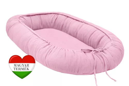 Scamp muszlin babafészek, rózsaszín.Méretek:Teljes mérete: 50cm×80cmFekvőfelülete: 28×60 cmMagassága:12cm Anyaga:Huzat: 100% pamut un. muszlinPerem töltet: antiallergén, 100% szilikonizált poliésztergolyóA termék a fekvőbetét eltávolítása után 30°C-on klórmentes mosószerrel mosógépben mosható.A perem töltet mosás során felfrissül, nem csomósodik.A babafészek cipzárral van ellátva, mely lehetővé teszi a töltet mennyiségének szabályozását.