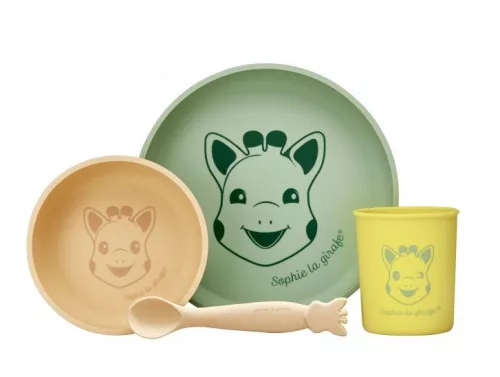 Komplett, bababarát szilikonból készült, törhetetlen étkészlet Sophie aranyos képmásával, hogy minden étkezés során egy régi jó barát ösztönözze babádat, hogy üresen hagyja a tányért!
