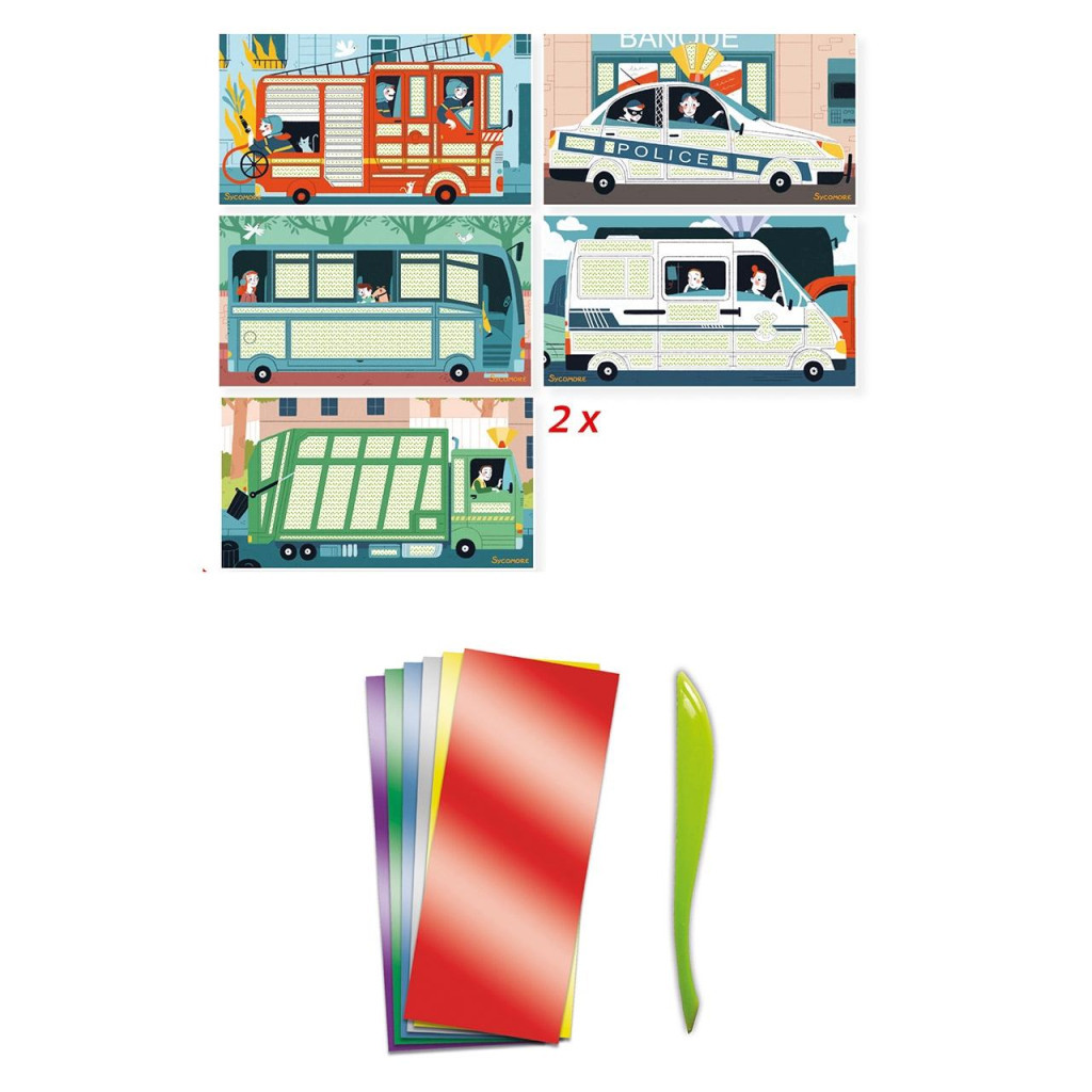 A Sycomore Artissimo Díszíts fémfóliával - Járművek csomagban található eszköz segítségével eltávolíthatod a képek egyes elemeiről a ragasztót védő rétegeket, majd fémfóliákkal dekorálhatod ki őket.