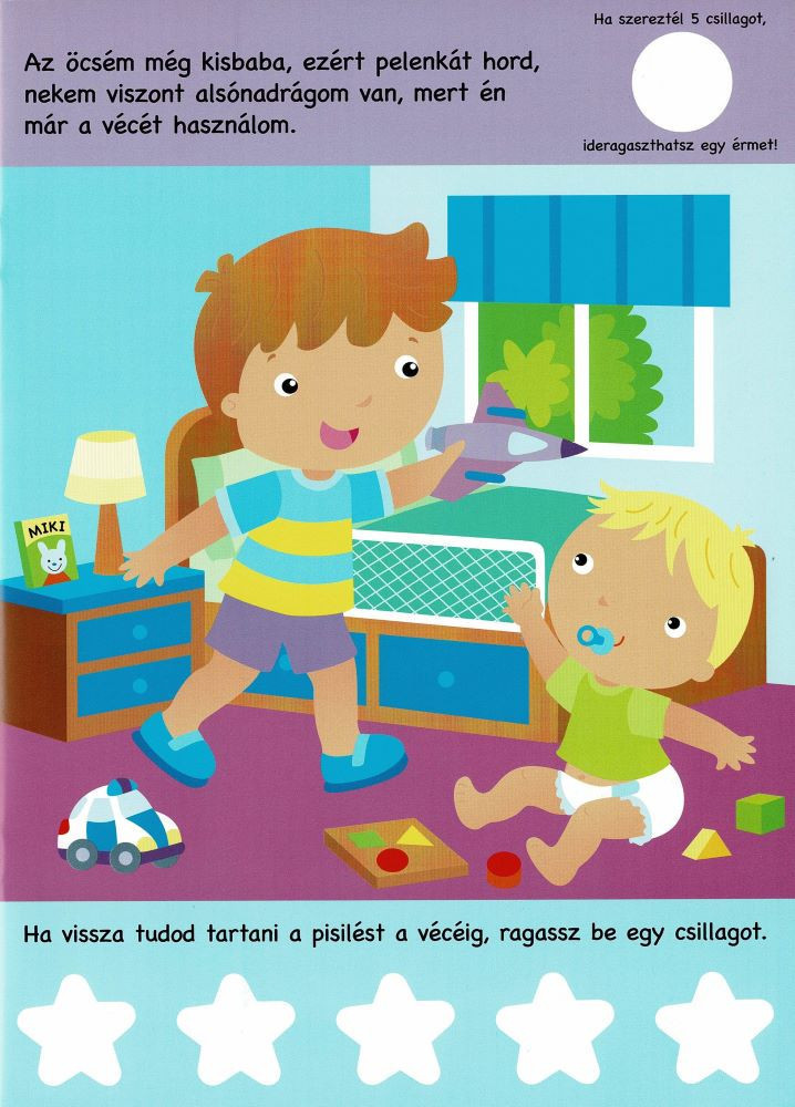 Ragassz be egy csillagot, ahányszor csak sikerül valamit egyedül megoldanod. Ha összegyűjtöttél 5 csillagot, kiérdemelsz egy érmet. Ha minden feladatot teljesítettél, elnyered a kupát! Sok szerencsét, Te már olyan nagy vagy, hogy egyedül mehetsz vécére.