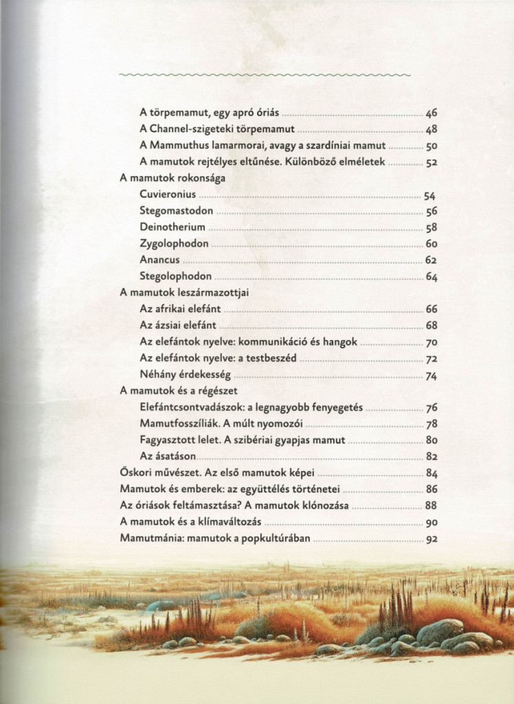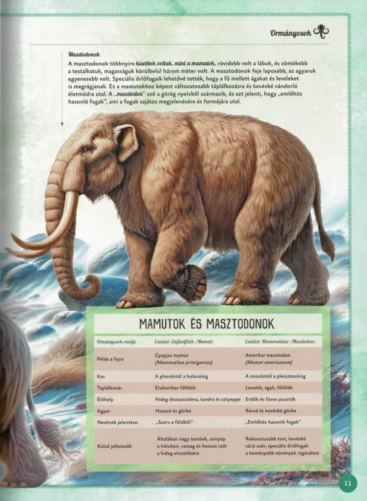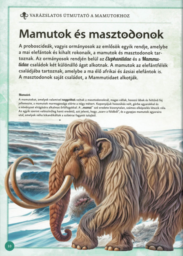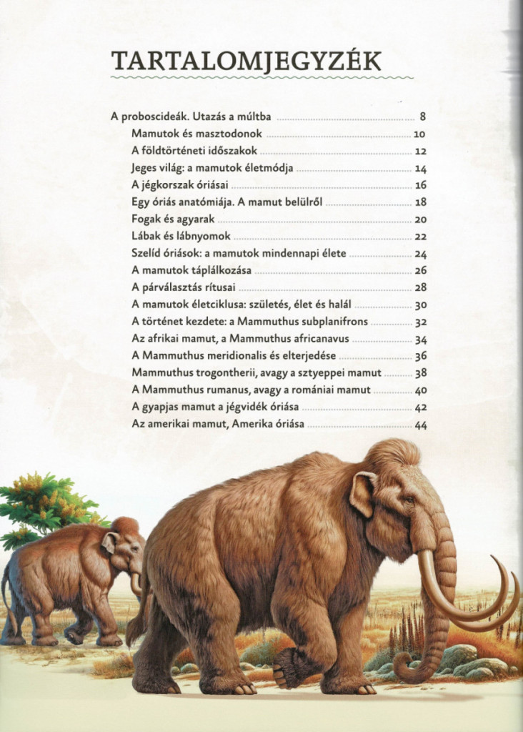 A könyv nemcsak a legismertebb gyapjas mamutról szól, hanem más ősi ormányosokról is mesél: mastodonokról, elefántősökről, és még néhány furcsa, kevésbé ismert rokonról is.