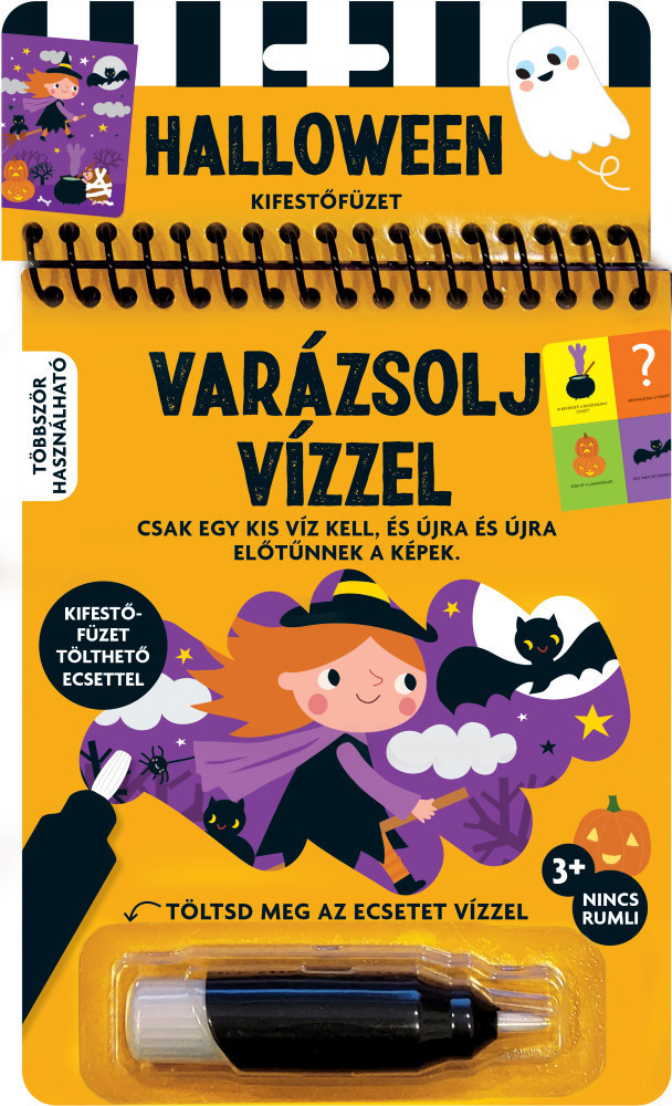 Töltsd meg vízzel a tollat, és hívd elő a képek elemeit, így lesznek teljesek az oldalak, és megválaszolhatod a füzet kérdéseit. Ha a foltok megszáradnak, újra fehérek lesznek, és kezdheted elölről, amikor csak kedved tartja.