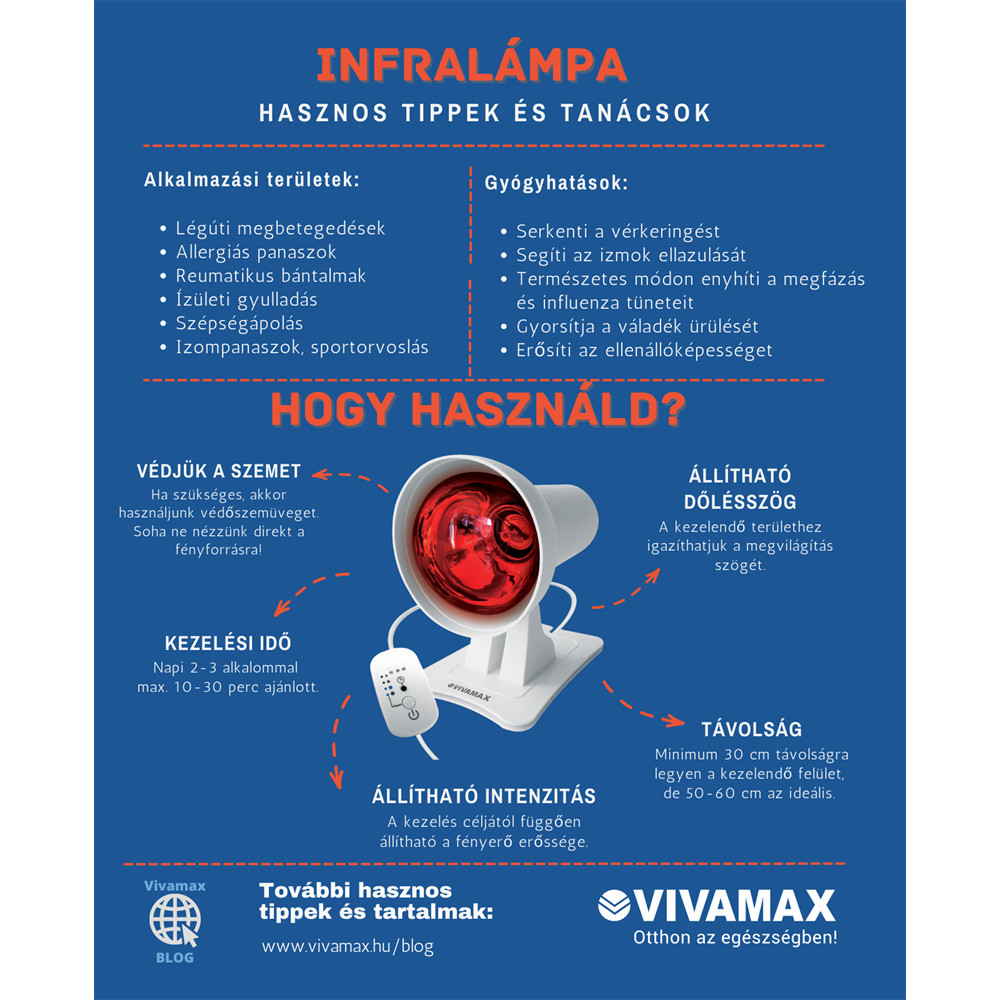 A meleg fény áldásos gyógyító hatását az emberiség már 5000 évvel ezelőtt felismerte és használta gyógyításra. A fény közérzetjavító tulajdonságát a napozás során tapasztalhatjuk leginkább, ilyenkor értékes infravörös fényhez jut szervezetünk. A téli naphiányos hónapokban ennek pótlására az otthon használatos infravörös lámpa a legalkalmasabb. 780-1400 nm közötti sugárzási tartományának köszönhetően az infravörös fény kiegészítő gyógymódként használható a fül, orr, torok megbetegedései, valamint különböző reumatikus panaszok estén. Széles körben használják az arc- és szépségápolásban, különösen bőrtisztításra. Fél méteres körzetben fertőtleníti a levegőt, pótolja a napfényt, életkedv generáló. Kellemesen átmelegíti arcunkat, de talpunkat és egyéb testrészeinket is kezelhetjük vele. Talpunk infrázása az egész szervezetre jótékony hatással van, erősítheti ellenállóképességünket!