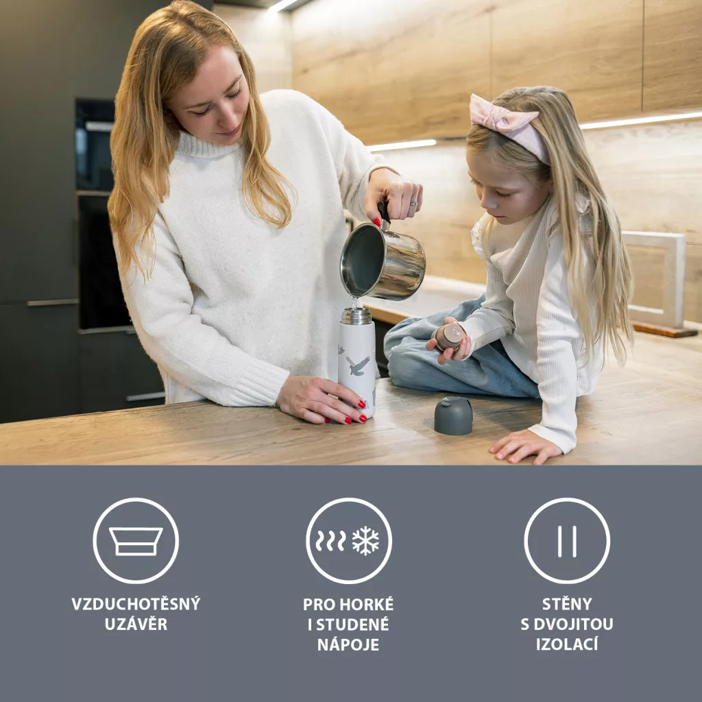 Kiváló minőségű, 400 ml-es folyadéktároló termosz, amely a forró italokat akár 12 órán át, a hidegeket pedig akár 24 órán át megőrzi. Korrózióálló, prémium rozsdamentes acélból készült. A szivárgásmentes fedél megakadályozza a folyadék kiömlését, a felső öntőzár pedig biztosítja a kényelmes használatot még egyenetlen úton autózva is. A dupla zárórendszer gondoskodik arról, hogy a gyermek ne forrázza le magát. A termosz fedele csészeként is használható.