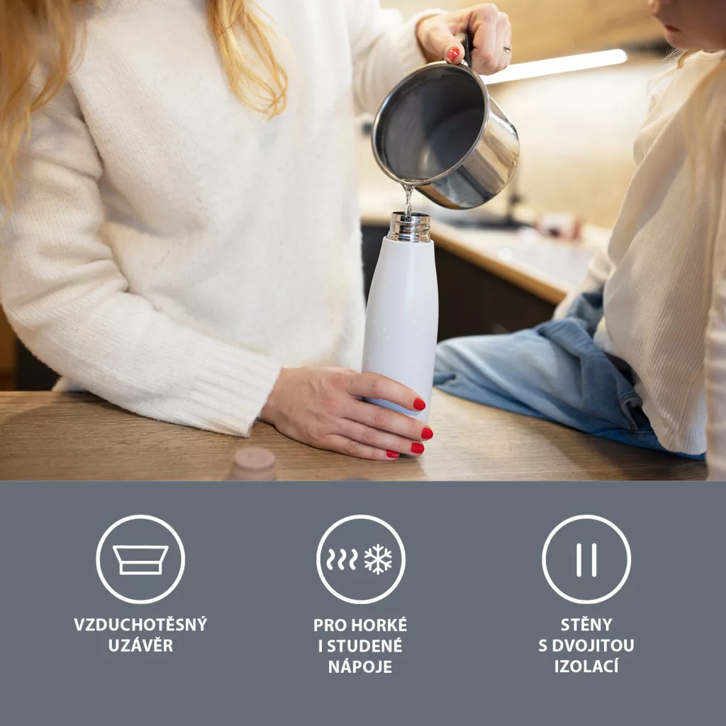 Magas minőségű, 480 ml-es folyadéktároló termosz, amely a forró italokat akár 12 órán át, a hidegeket pedig akár 24 órán át tartja meg. Kiváló minőségű, korrózióálló rozsdamentes acélból készült. A szivárgásmentes kupak megakadályozza a folyadék kifolyását. A vákuumszigetelésnek köszönhetően a termosz nem melegszik fel kívülről, még forró ital esetén sem. A termosz kényelmes fogását praktikus fogantyú teszi lehetővé.