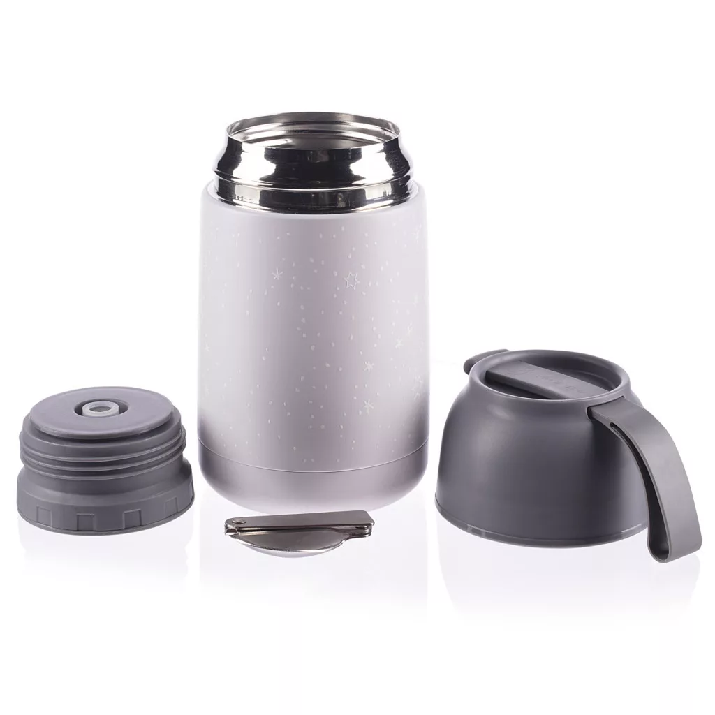 A csomag tartalmaz egy összecsukható kanalat, amely tökéletesen illeszkedik a fedélbe, így bárhol élvezheti a meleg zabkását vagy levest. A termosz fedele pohárként vagy tálként is használható. A felső zárófedél biztonsági szeleppel van ellátva, amely kiengedi a nyomást, így könnyen nyitható, és elkerülhető a gőz okozta égési sérülés.