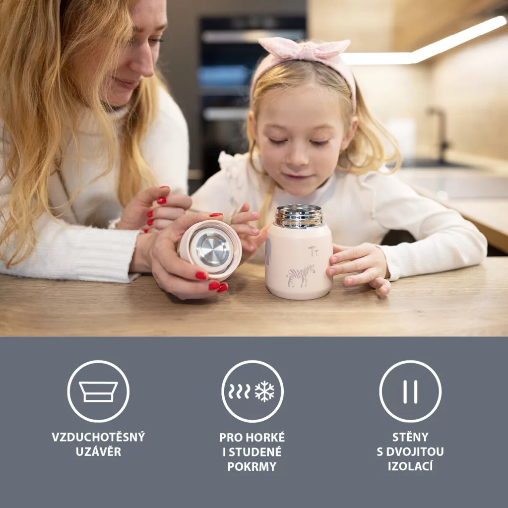 Kiváló minőségű étel- és bébiételtermosz 300 ml-es űrtartalommal, amely akár 12 órán át melegen, akár 24 órán át hidegen tartja az ételt. Rozsdamentes acélból készült, amely ellenáll a korróziónak. A szorosan záródó fedél biztosítja, hogy a termosz ne szivárogjon. A vákuumos szigetelésnek köszönhetően a termosz külső felülete nem melegszik fel forró tartalom esetén sem.