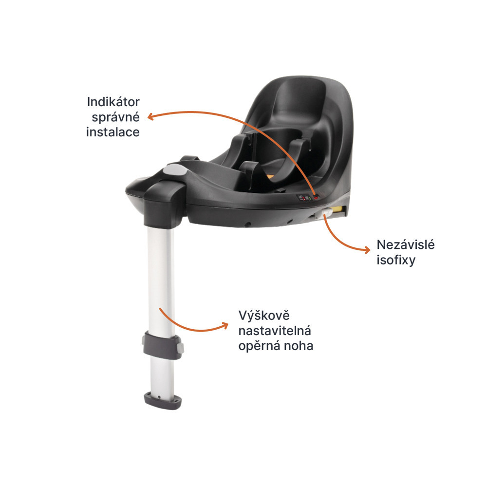 Független ISOFIX csatlakozók indikátorokkal biztosítják az autósülés egyszerű és biztonságos rögzítését a járműben. Az autósülés támasztólábbal van ellátva, amely további stabilitási pontot nyújt, és a támasztólábhoz is tartozik helyes beállítást jelző indikátor. A nagyobb stabilitást a biztonsági ív garantálja. Az autósülés alapra történő helyes rögzítését a jelzők igazolják vissza. Az autósülés egyszerűen, retesz segítségével eltávolítható az alapról.