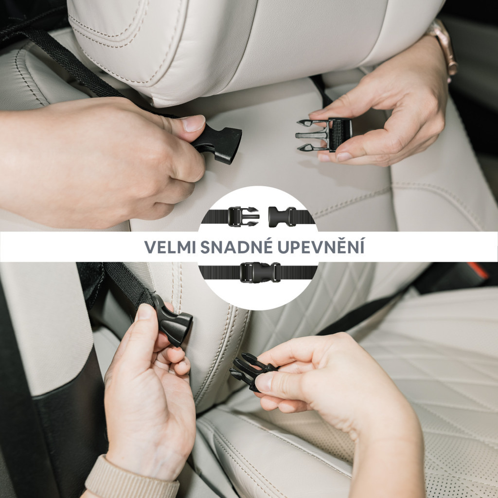 Állítható biztonsági hevederek, amelyek bármely fejtámlához illeszkednek. Az egyszerű és gyors telepítésnek köszönhetően ez az ülésvédő a legtöbb autóban használható.