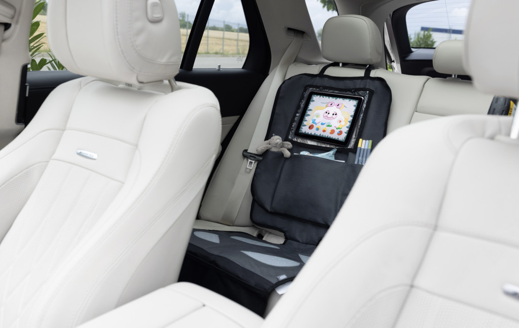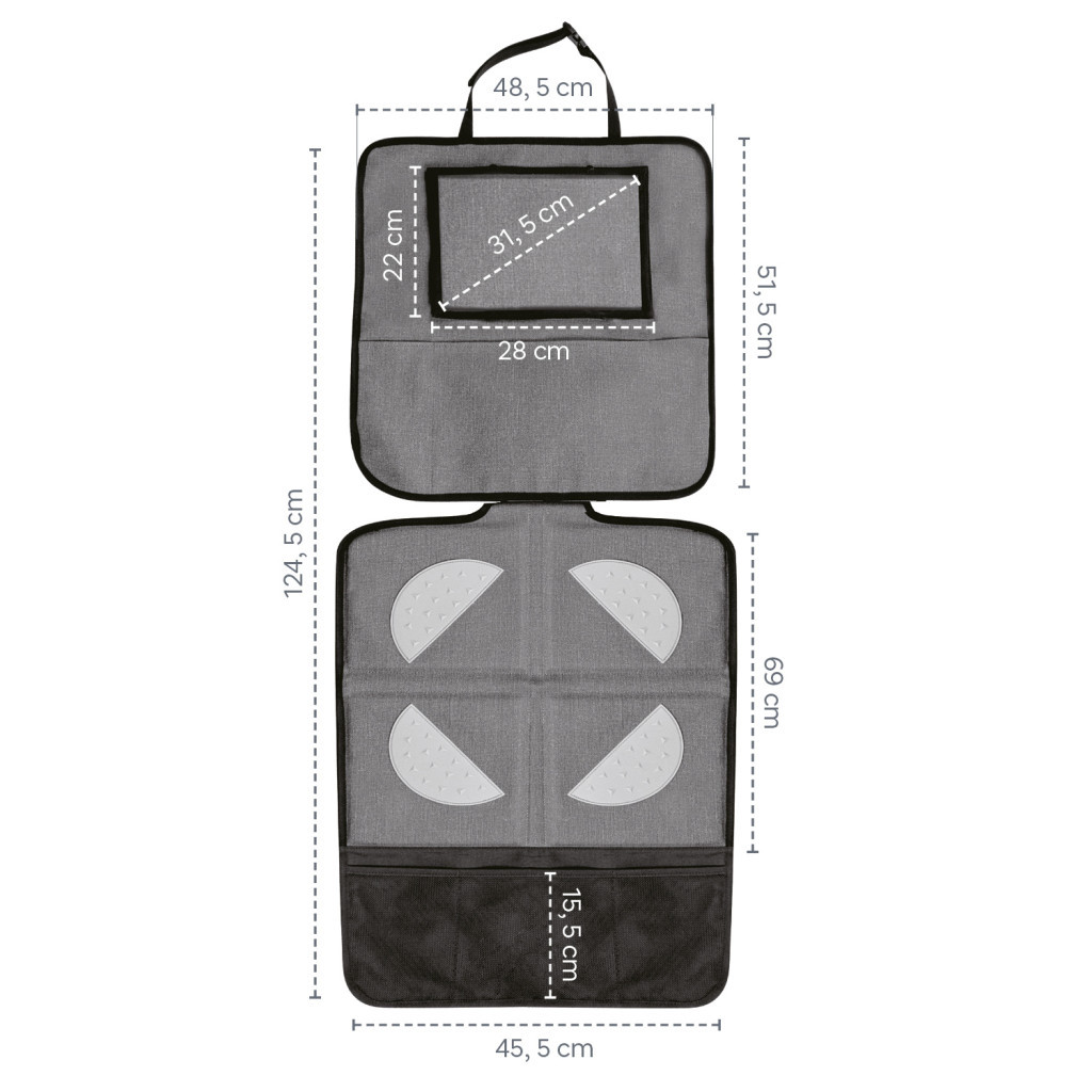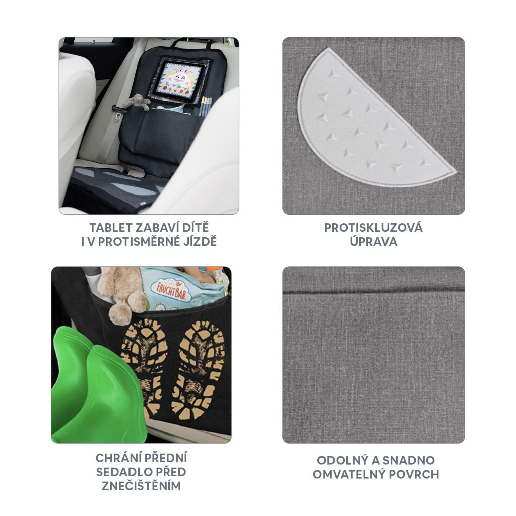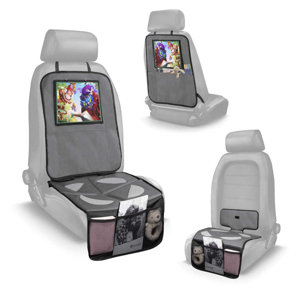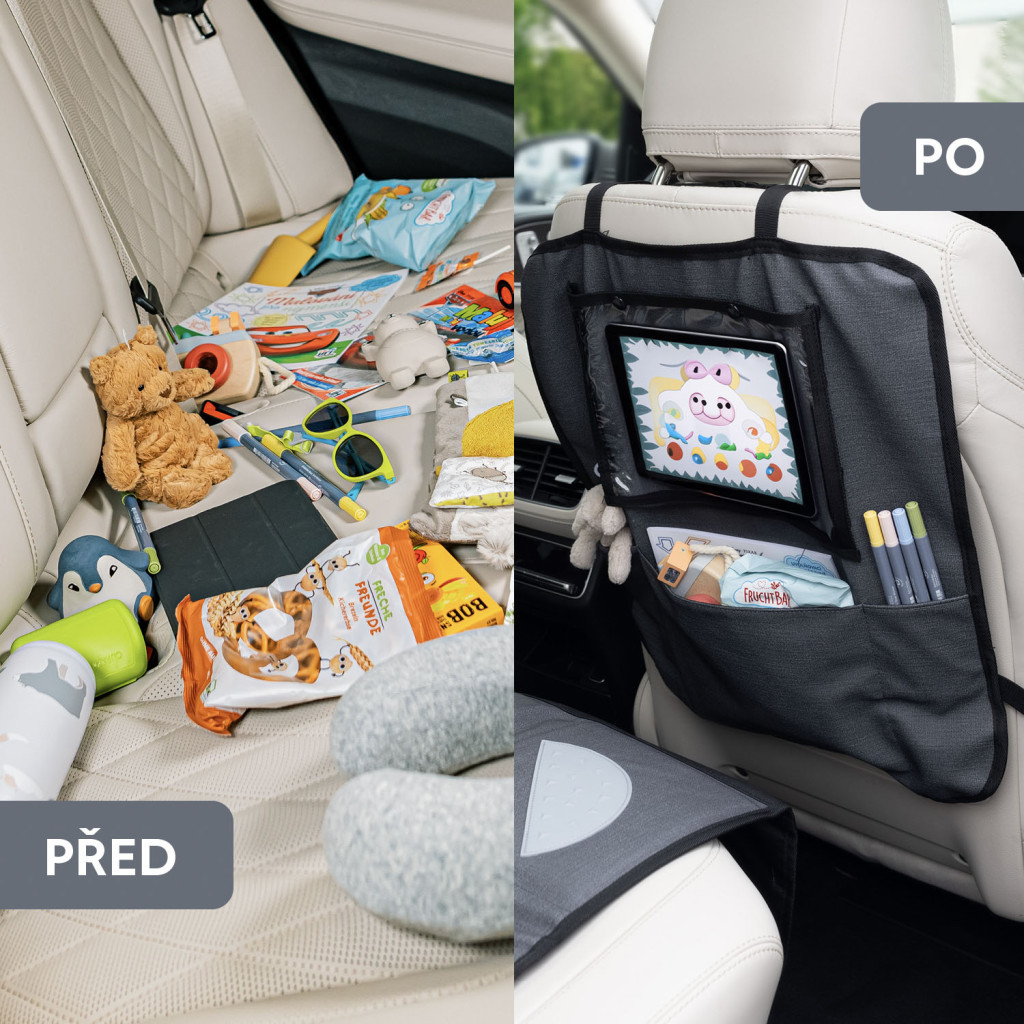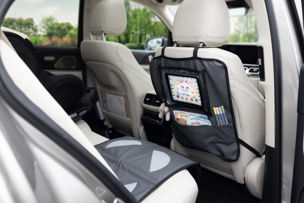 Védje az autóülést, és tartsa kéznél a szükséges dolgokat a tabletzsebes ülésvédővel. Tökéletes a rendezett és kényelmes családi kirándulásokhoz.