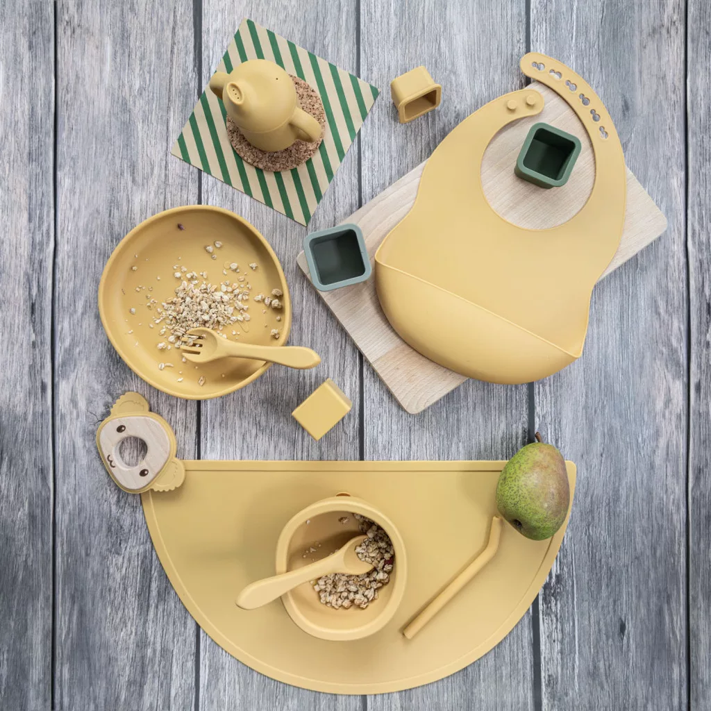 Az élelmiszer-minőségű szilikonból készült készlet tartalmaz egy magasított szélű és tapadókorongos tálat, osztott tányért tapadókoronggal, állítható előkét és egy kanalat.