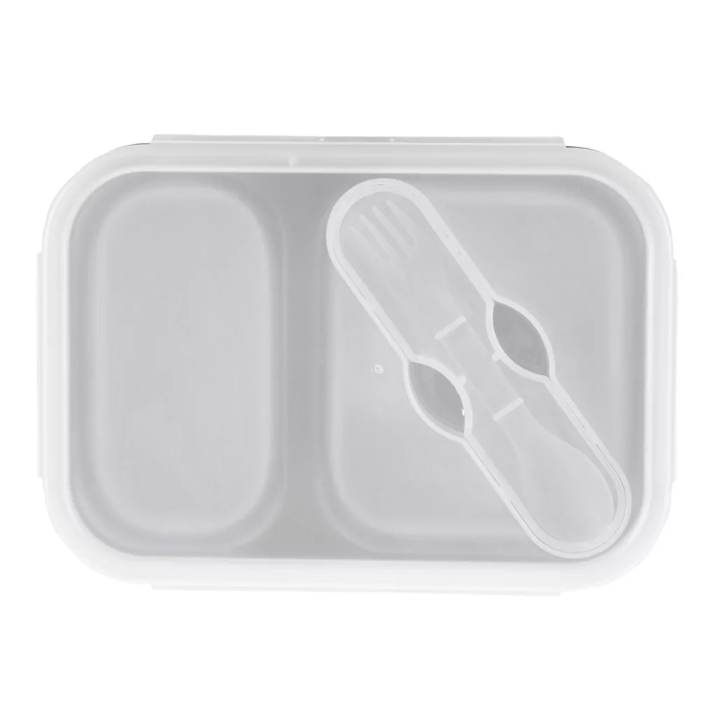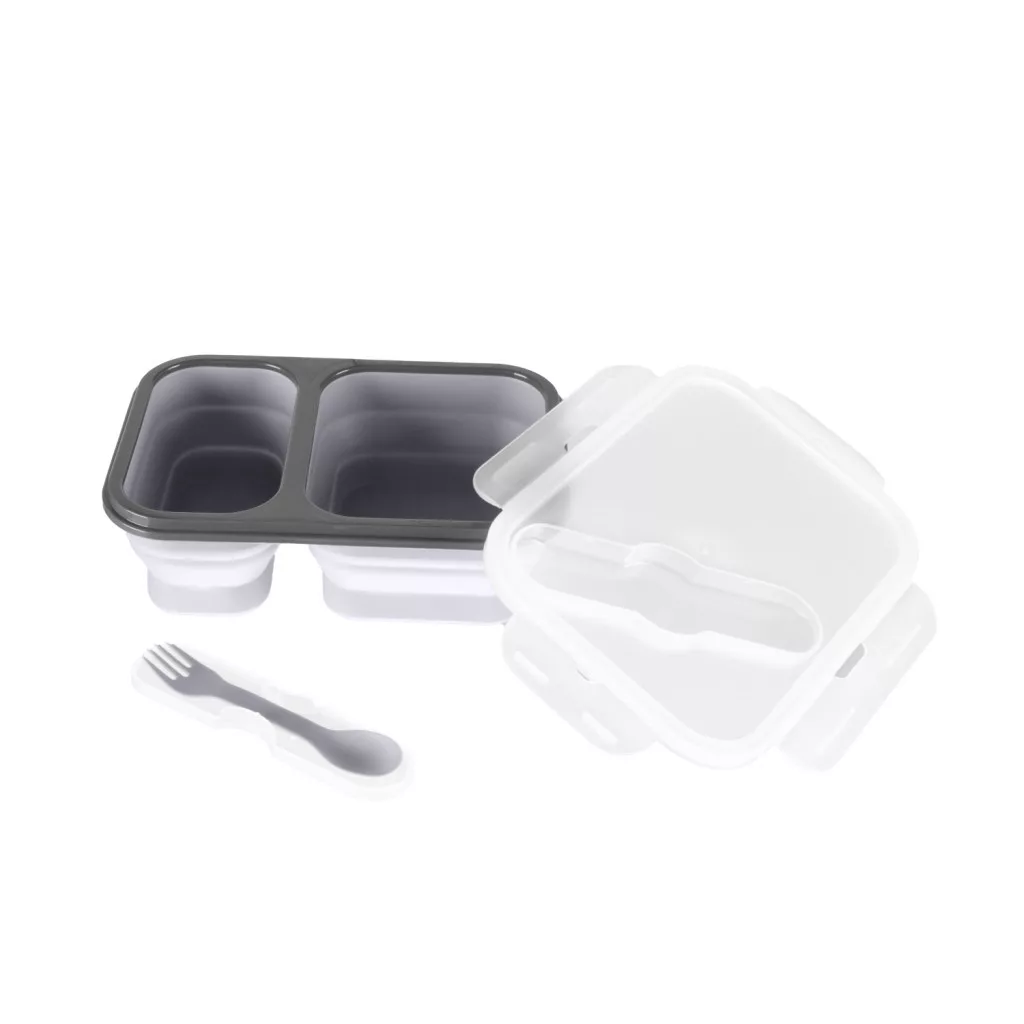 Élelmiszeripari szilikon, összecsukható, 2 különálló rekesz, jól záródó fedél, mikrohullámú sütőben használható, beépített rekesz az evőeszközöknek, evőeszköz a csomag része – ez a szilikon uzsonnás doboz evőeszközökkel.