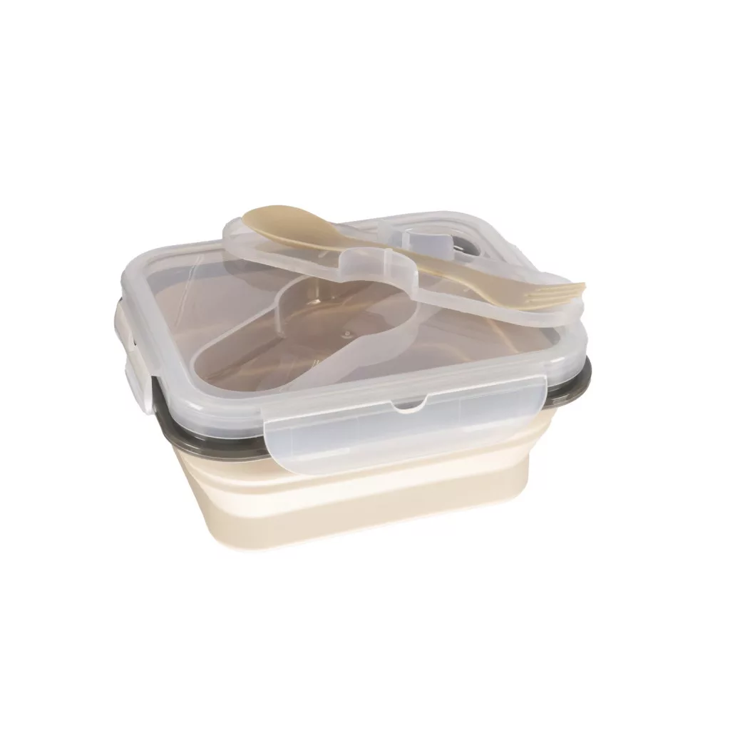 Ez az ételtartó doboz biztonságos, élelmiszeripari szilikonból készült, amely nem mérgező és törésálló. Nagy előnye az egyszerű összecsukhatóság, amelynek köszönhetően akár 60%-kal is csökkenti a méretét, így ideális társ a kirándulásokhoz. A fedél szorosan záródik, beépített rekesszel rendelkezik az evőeszközök számára – a kanál és villa praktikus tokban található.