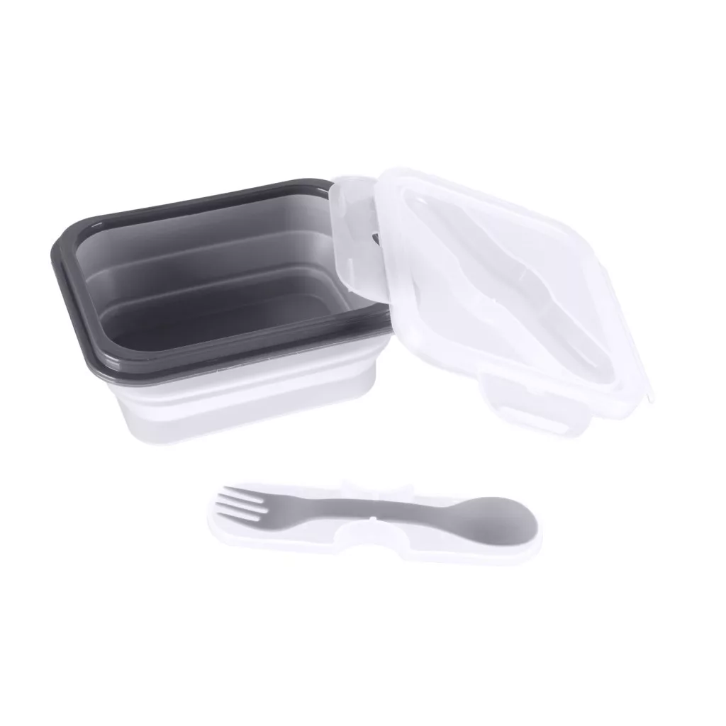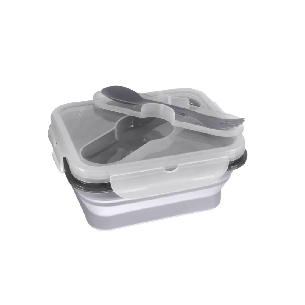 Ez az ételtartó doboz biztonságos, élelmiszeripari szilikonból készült, amely nem mérgező és törésálló. Nagy előnye az egyszerű összecsukhatóság, amelynek köszönhetően akár 60%-kal is csökkenti a méretét, így ideális társ a kirándulásokhoz. A fedél szorosan záródik, beépített rekesszel rendelkezik az evőeszközök számára – a kanál és villa praktikus tokban található.
