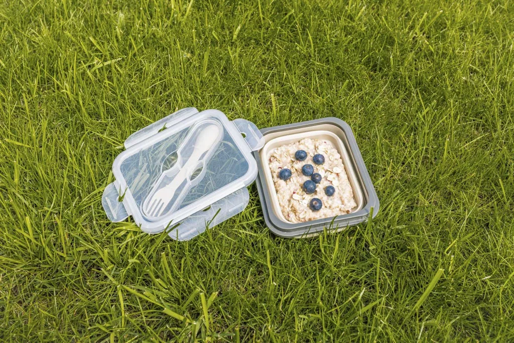Élelmiszeripari szilikon, összecsukható, jól záródó fedél, mikrohullámú sütőbe tehető, beépített rekesz az evőeszközöknek, evőeszköz a csomag része – ez a szilikon ételtartó doboz evőeszközökkel.