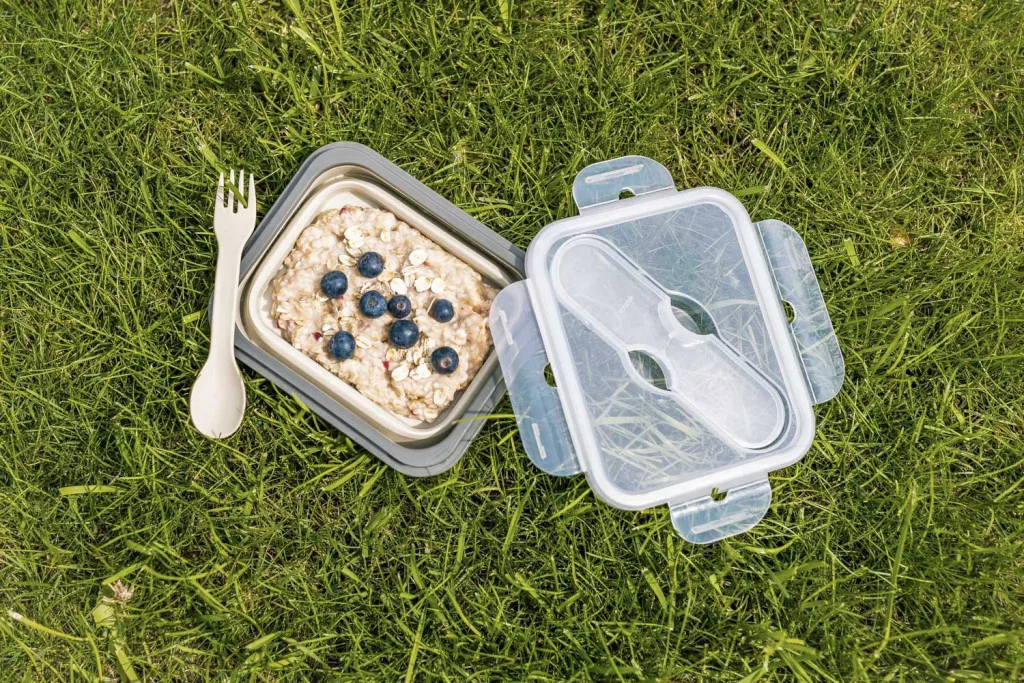 Élelmiszeripari szilikon, összecsukható, jól záródó fedél, mikrohullámú sütőbe tehető, beépített rekesz az evőeszközöknek, evőeszköz a csomag része – ez a szilikon ételtartó doboz evőeszközökkel.