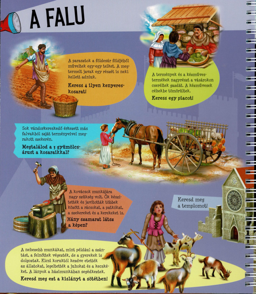 • A falu élete: betekintést nyerünk a földművesek, kovácsok és gyerekek mindennapjaiba. Hol van a piacon a kosár kenyérrel? Ki tereli a kecskéket? Hol rejtőzik a kislány a sötétben?