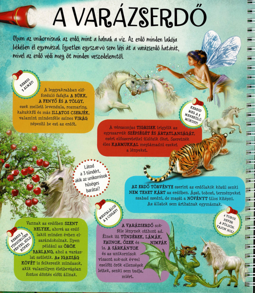 Minden oldal tele van rejtvényekkel: meg kell keresni például 3 tündért, 4 madarat, 5 aranyérmét vagy akár egy elrejtett unikornist. Ez nemcsak izgalmas időtöltés, hanem remekül fejleszti a megfigyelőképességet is