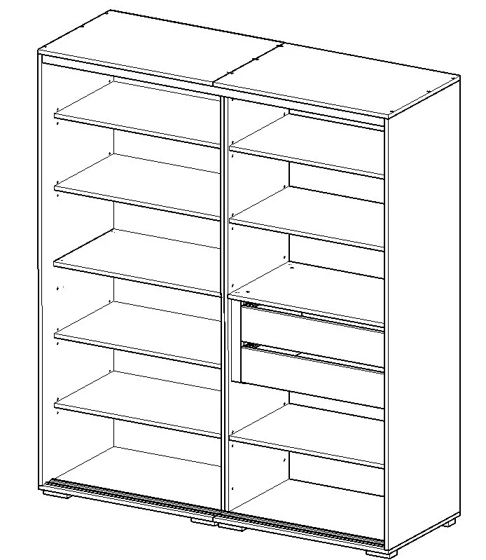• A bal oldali rész polcos és akasztós is lehet tetszés szerint. (polcokat és 2 db vállfatartót is mellékelünk) A jobb oldali rész 2 db fékezős fiókot tartalmaz. A fiókok felett polcos + akasztós rész található.