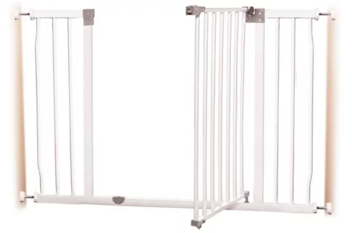 Ez a masszív fém biztonsági kapu ideális választás szélesebb átjárókhoz, ahol a megbízható védelem mellett a kényelmes használat is fontos. Stabil szerkezete és modern kialakítása hosszú távon is biztos megoldást nyújt a gyermekek biztonságához.