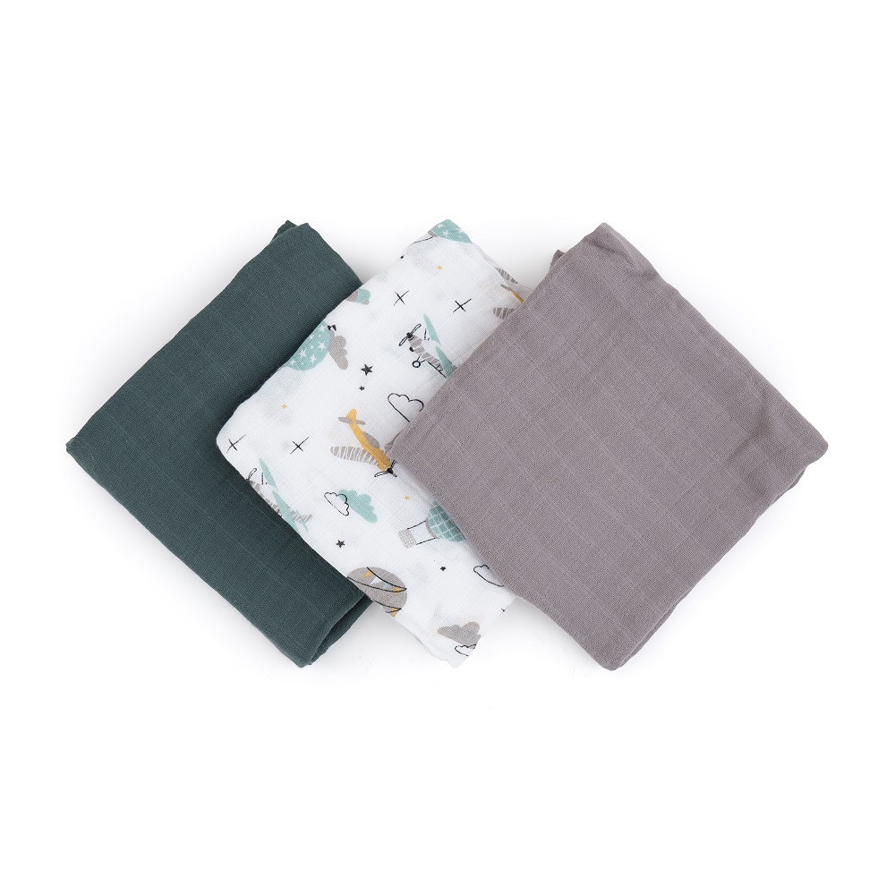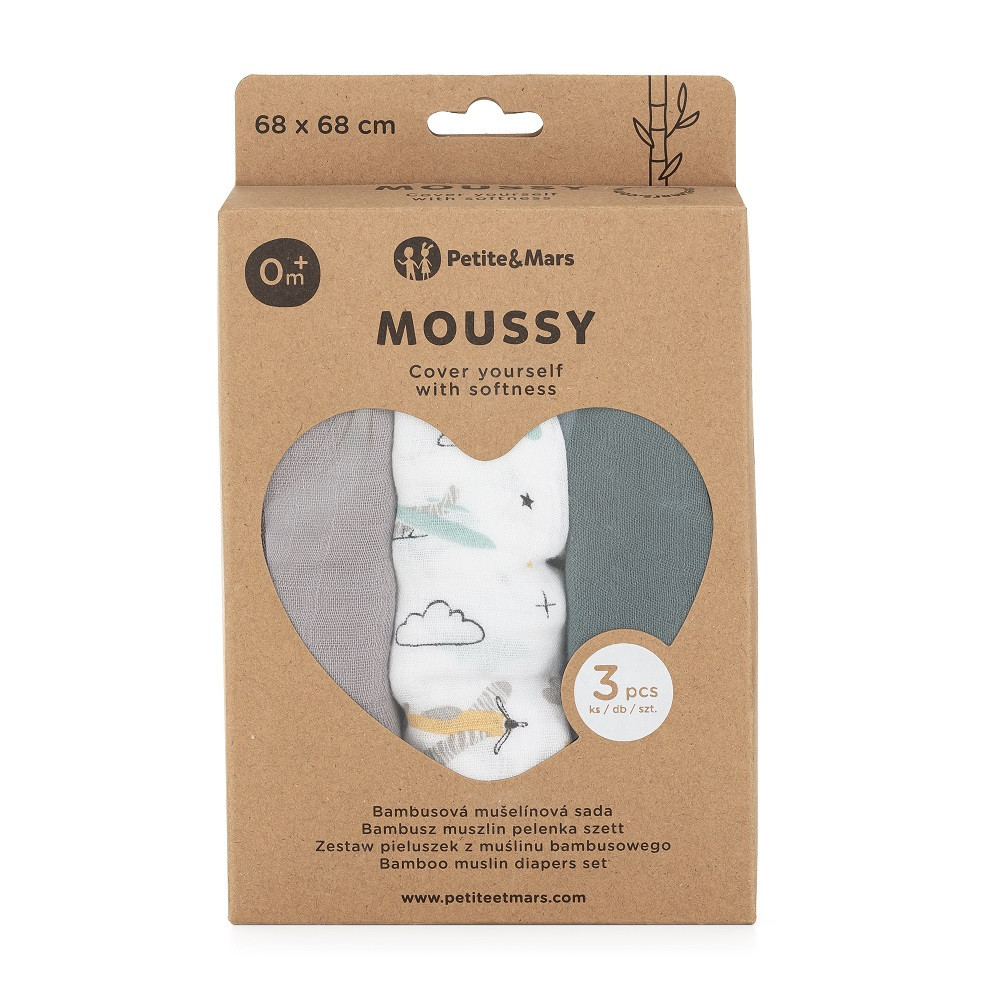 Petite&Mars Bambusz muszlin 3db-os pelenka szett Moussy Grey Planes, 68 x 68 cm