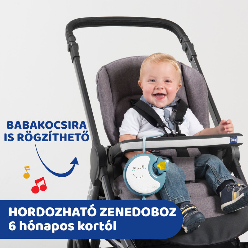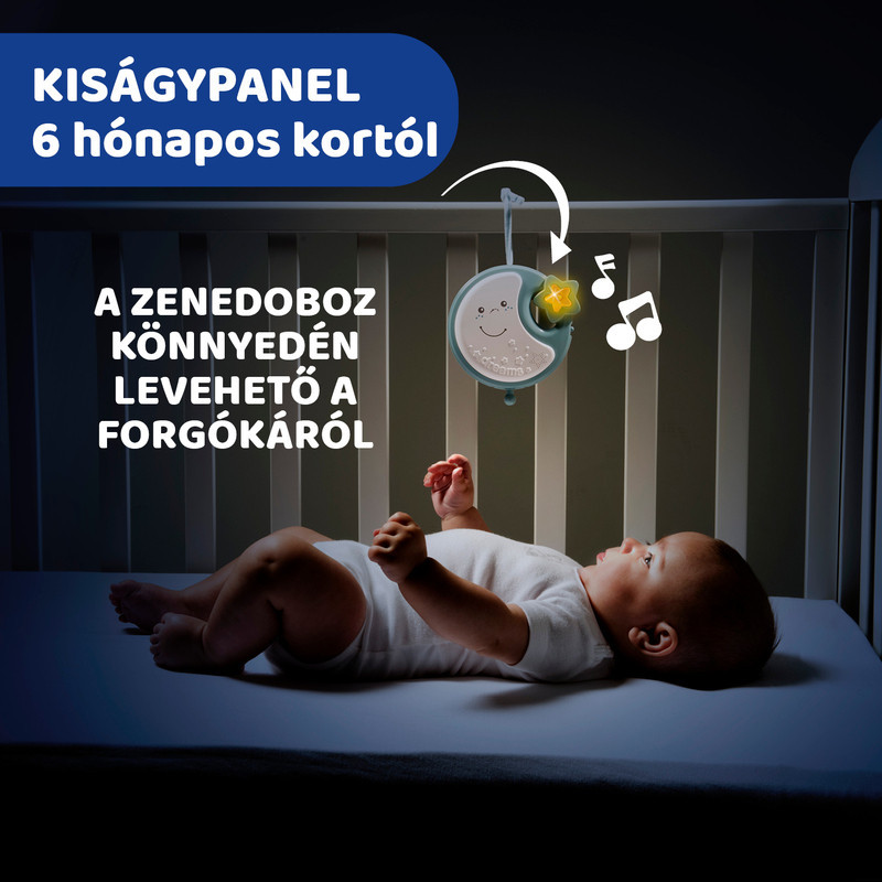 • A forgóka felső részén lévő zenélő-világító Holdacska levehető és külön is rögzíthető a kiságy szélére vagy akár a babakocsi első karfájára. A Holdacska zenél és fényeket ad, akár útközben is