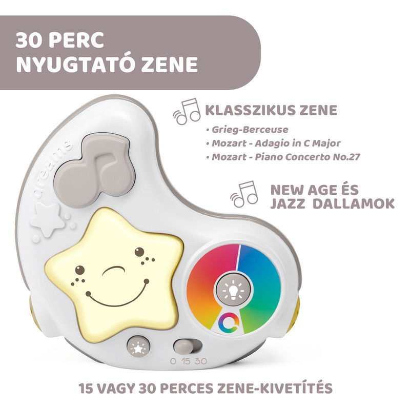 • Éjszakai fény - az éjjeli szekrényen: a Félhold alakú eszköz levehető és önállóan is használható. Sima felületre helyezve, például az éjjeliszekrényre, éjjeli fényként funkcionál. A dallamok és a kivetített fényjátékok így elkísérik a babát az elalváshoz is. A középső nagycsillag, az ún. csillagfény szolgál éjszakai fényként. A be- vagy kikapcsolásához a csillag alatt lévő gombot kell megnyomni. Ez a csillagfény akkor is működik a bekapcsolása után, ha a 15/30 perces zenés-fényes lejátszást nem kapcsoljuk be