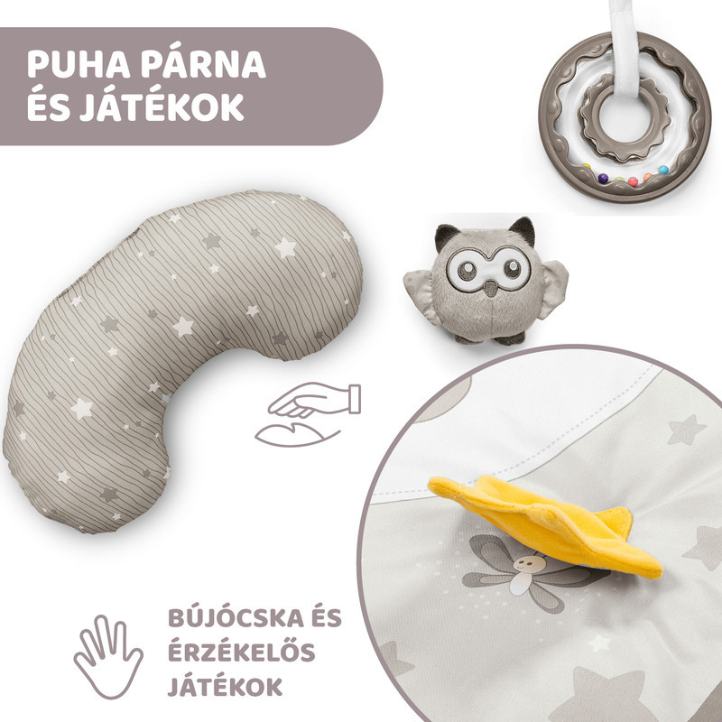 Az újszülött kortól használható játszószőnyeg, klasszikus, jazz és new age dallamokkal szórakoztatja napközben csemetédet. A boltíven található lelógó játékok hosszú percekig elbűvölik csecsemődet.