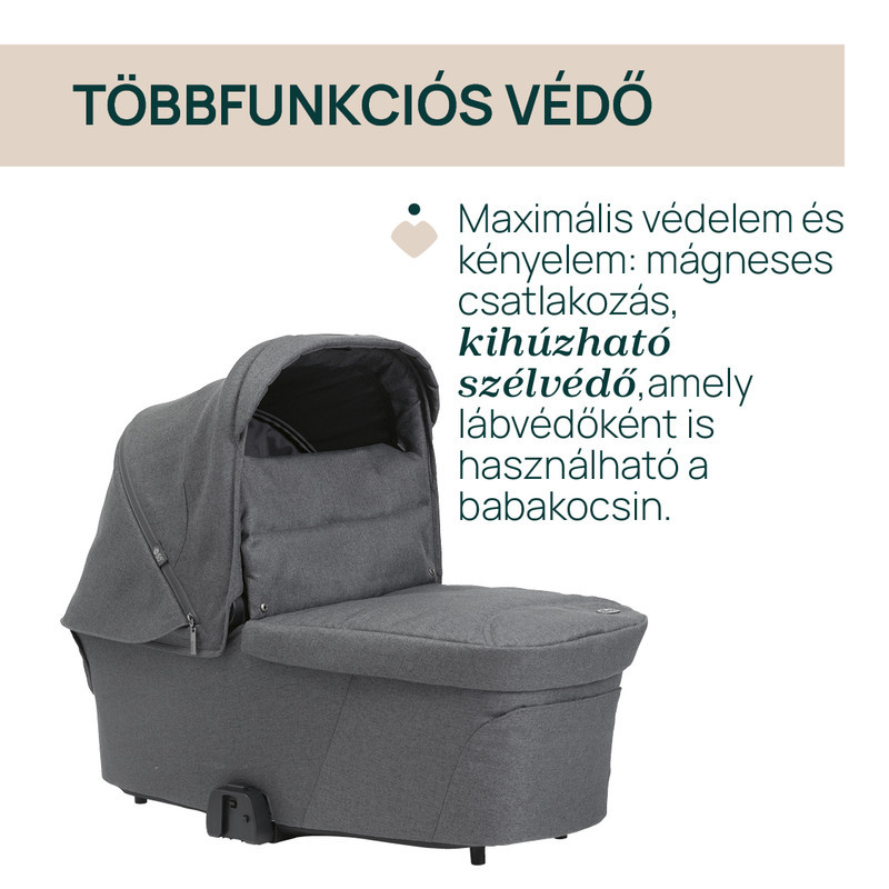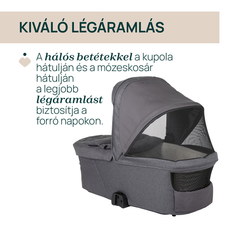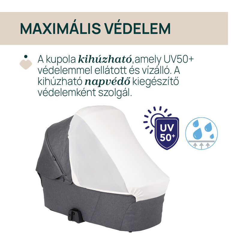 • Védelem minden évszakban: kihúzható, UV50+ és vízálló napfénytető, kihúzható szélvédő, oldalsó hálós betét szúnyoghálóként
