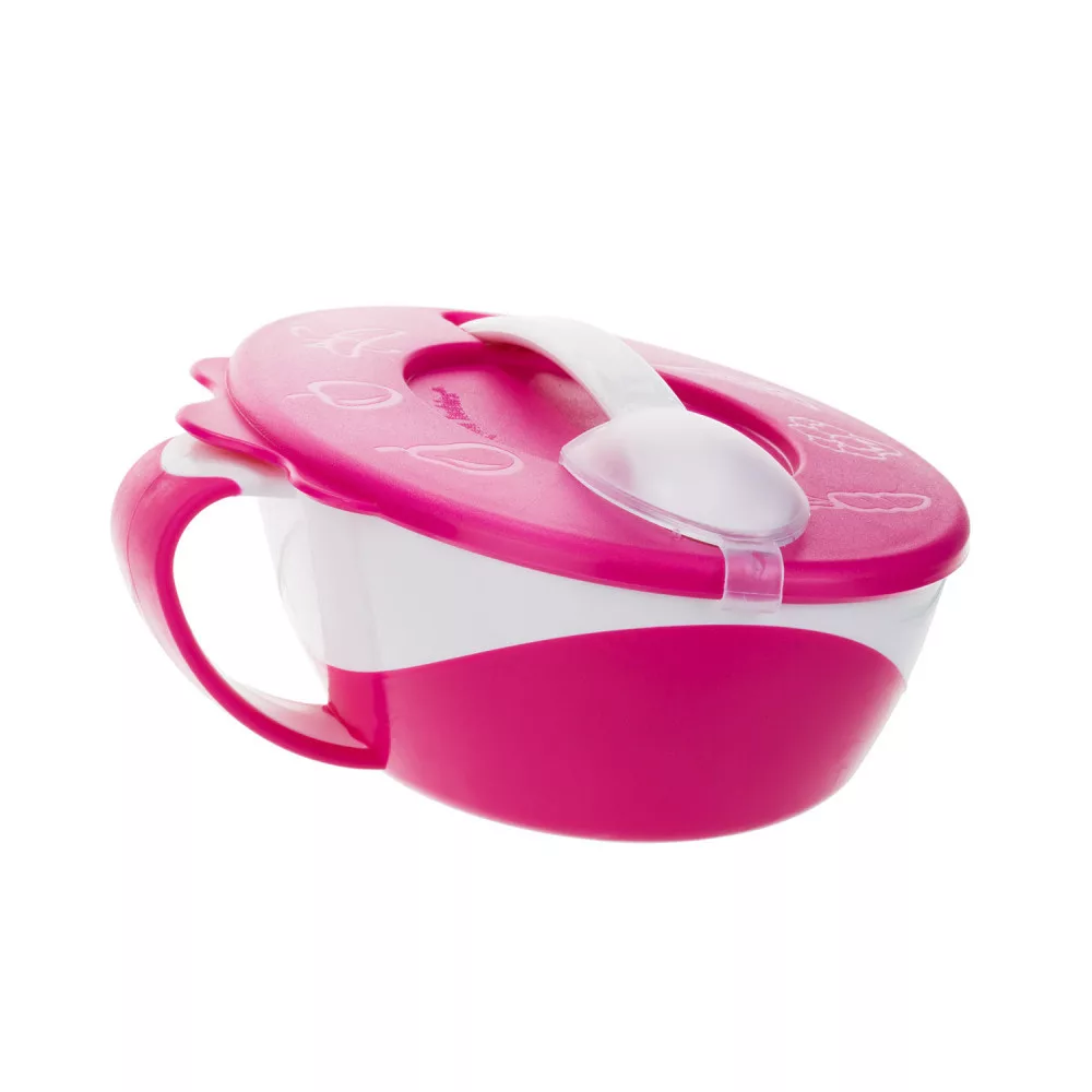 A törhetetlen műanyagból készült, fedeles, csúszásmentes tál, ideális ha sétálni vagy kirándulni mentek. Praktikus kanalának köszönhetően bármikor adhatsz enni csemetédnek, ha útközben megéhezik.