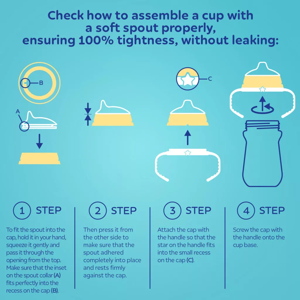 • A csöpögésmentes ivócsőr akkor sem szivárog, ha gyermeked megdönti vagy leejti a poharat